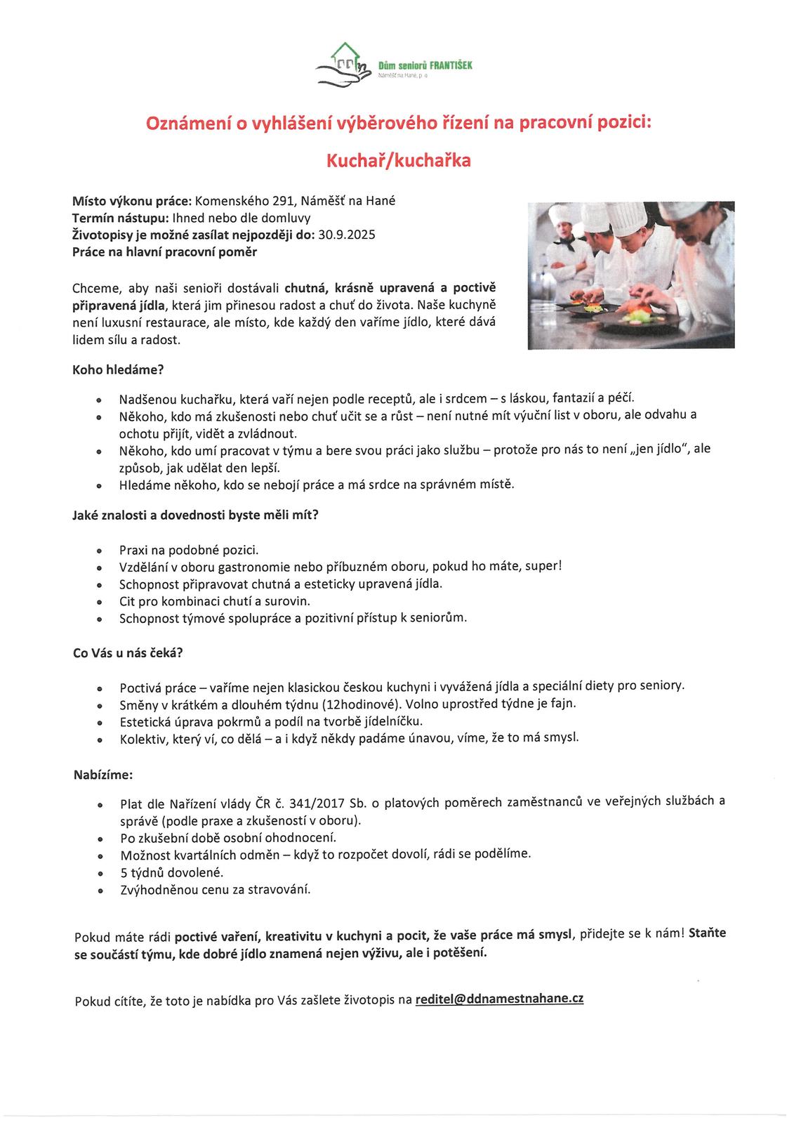 Nabídka práce - Dům seniorů František - pomocná kuchařka